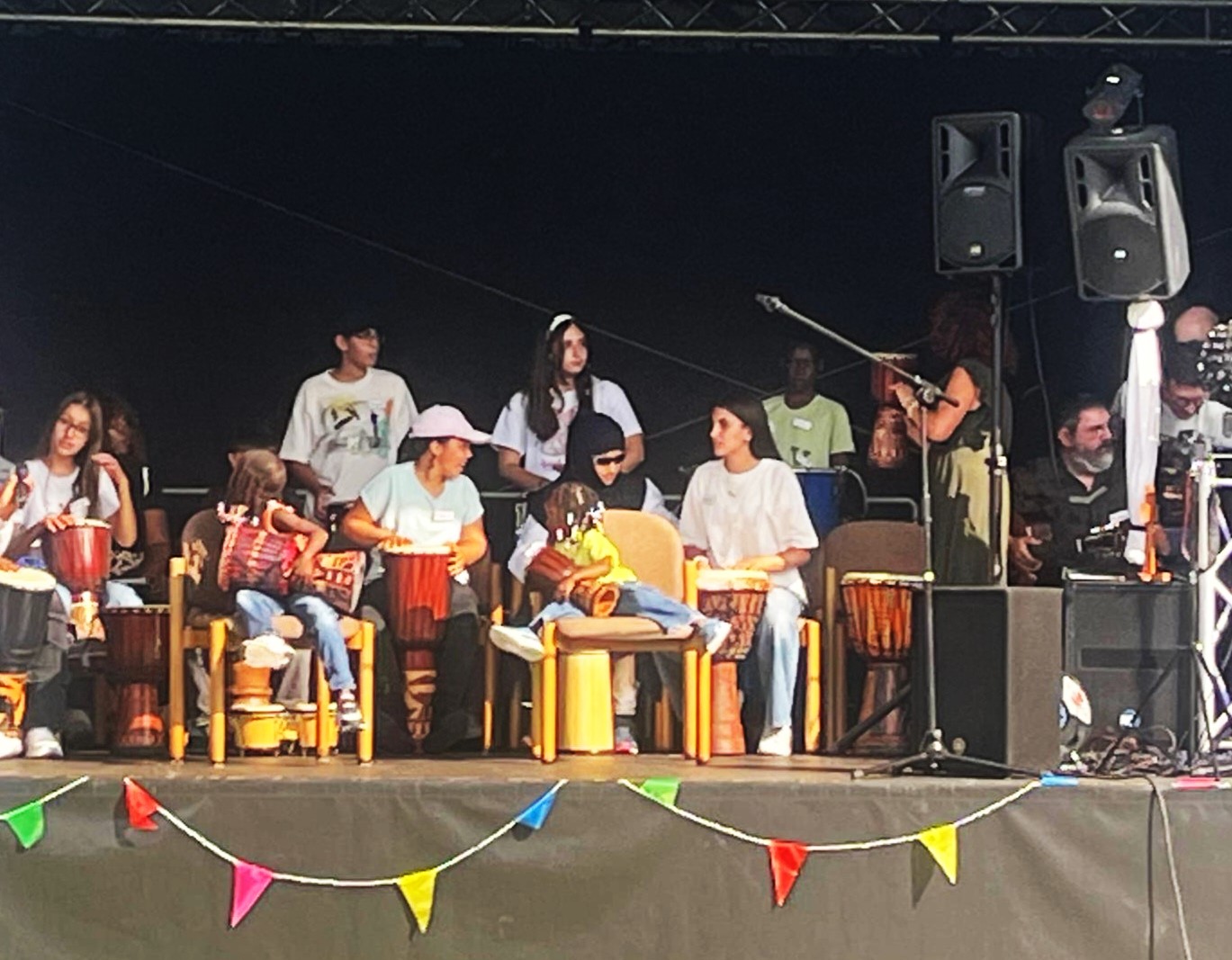 Der Auftritt der Trommlergruppe aus der Flüchtlingswohnanlage erstaunte die Zuhörer. Die Kids von 3 – 14 Jahren zeigten, was sie mit Wolfgang Scheer und Satheesh Wilson im letzten halben Jahr eingeübt hatten. Stolz waren alle, dass der Künstler Hesam Asadi sie mit den traditionellen Instrumenten seiner Heimat begleitete. Als dann die Lieder „Siahamba“ und „Sana sana“ mit Gesang unterstützt wurden, hörten alle beeindruckt zu. Auch das anschließende Solo von Hesam Asadi, mit für unsere Ohren ungewöhnlichen Melodieweisen, kam beim Publikum sehr gut an.